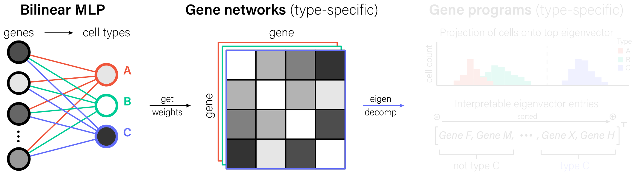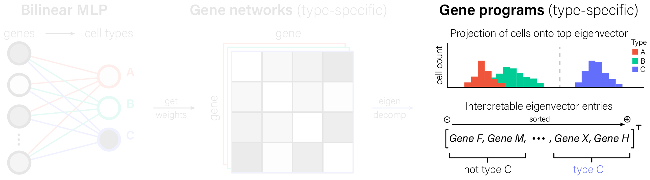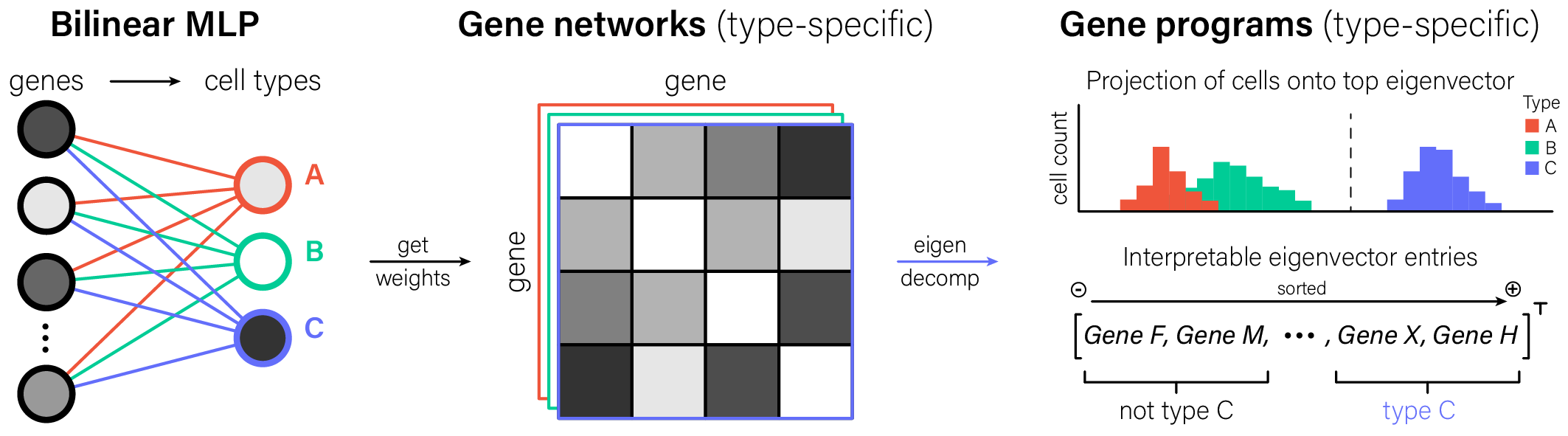 The key step in interpreting bilinear MLPs is seeing the weights for a given cell type output as a gene-gene graph. Once we have that graph, we can make the conventional single-cell transcriptomics move: eigendecompose its adjacency matrix to identify interpretable gene programs.