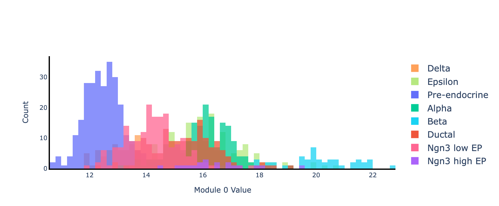 Now let’s plot histograms of cell projected onto module 0, separated by cell type. We’ll only visualize cells in the validation set to ensure our interpretations are transferrable. Module 0 clearly separates beta cells from the rest (blue cluster on the right).