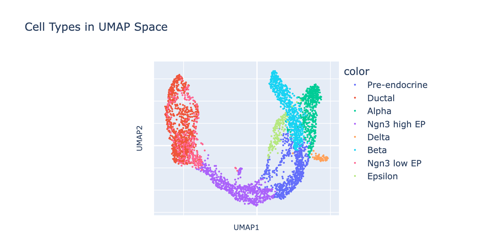 First, we visualize the data in UMAP space colored by cell type (UMAP coordinates were precomputed by the scvelo package). The dominant developmental trajectory runs from ductal cells (left) to alpha and beta cells (right), with finer branching between epsilon/alpha and beta populations. In the next section we’ll quantify these nested transcriptional scales; here our goal is simply to predict cell types.